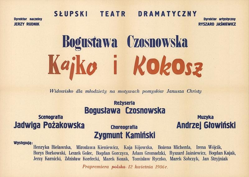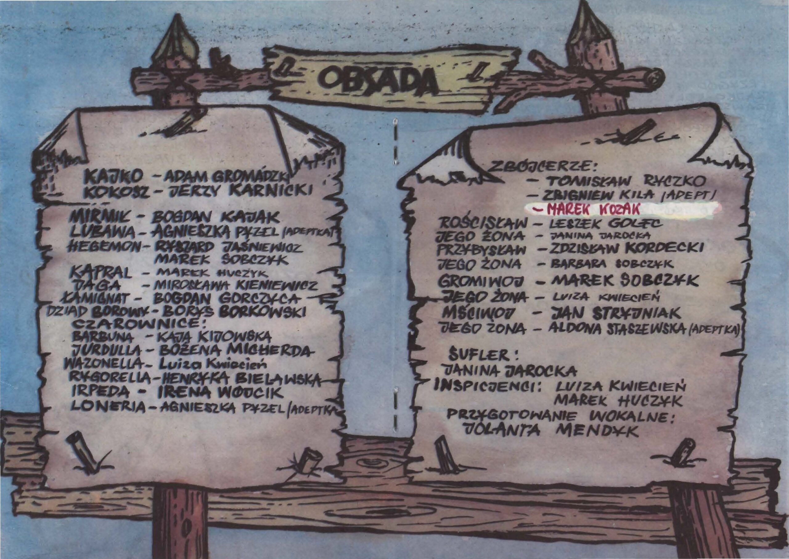Kajko – Adam Gromadzki, Kokosz – Jerzy Karnicki, Mirmił – Bogdan Kajak, Lubawa – Agnieszka Pyzel, Hegemon – Ryszard Jaśniewicz, Marek Sobczyk, Kapral – Marek Huczyk, Daga – Mirosława Kieniewicz, Łamignat – Bogdan Gorczyca, Dziad Borowy – Borys Borkowski, Barbuna – Kaja Kijowska, Jurdulla – Bożena Micherda, Wazonella – Luiza Kwiecień, Rygorella – Henryka Bielawska, Irpeda – Irena Wójcik, Loneria – Agnieszka Pyzel, Zbójcerze – Tomisław Ryczko, Zbigniew Kila, Marek Kozak, Rościsław – Leszek Golec, Jego żona – Janina Jarocka, Przybysław – Zdzisław Kordecki, Jego żona – Barbara Sobczyk, Gromiwoj – Marek Sobczyk, Jego żona – Luiza Kwiecień, Mściwoj – Jan Stryjniak, Jego żona – Aldona Staszewska