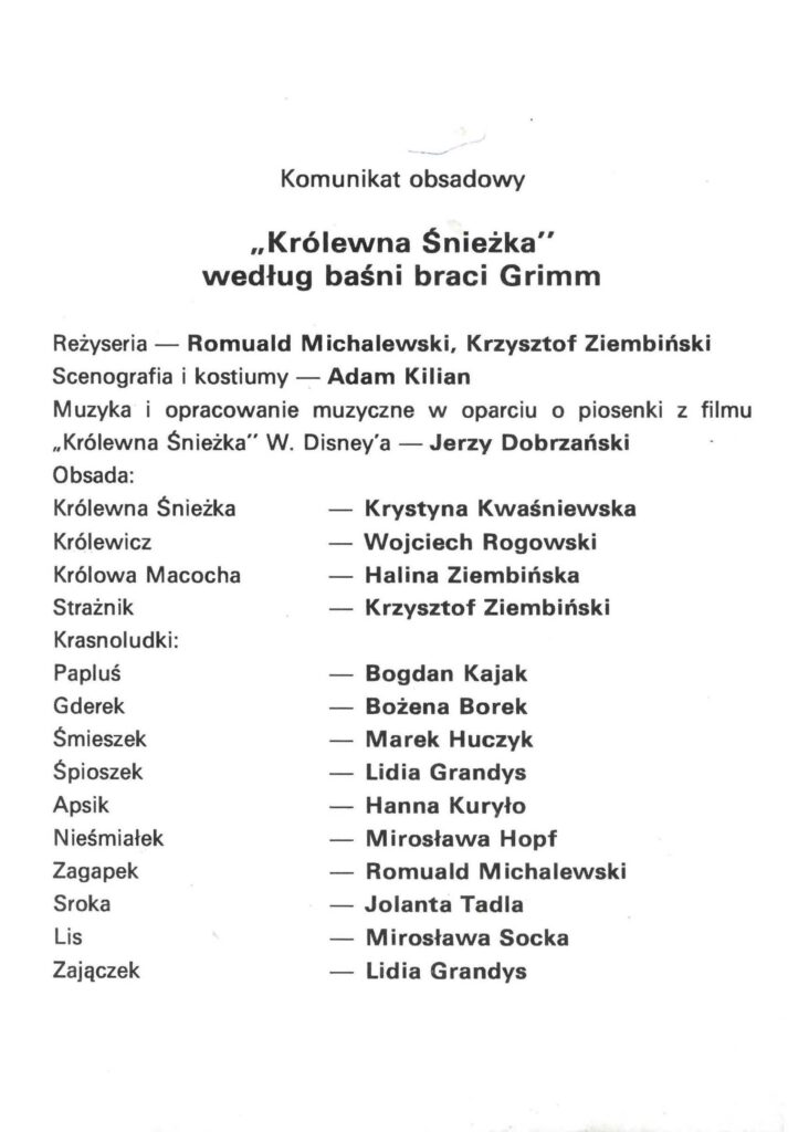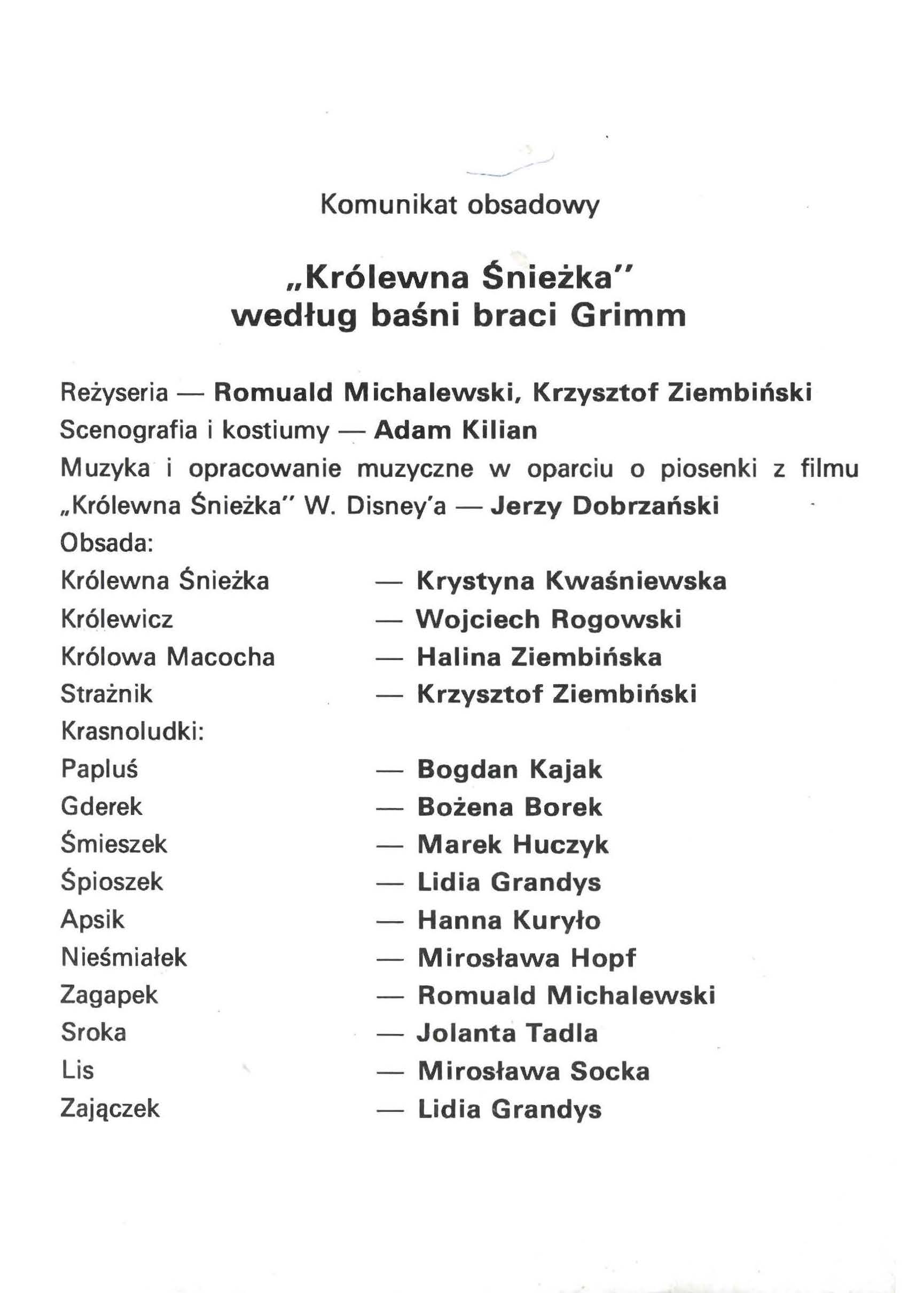 Królewna Śnieżka – Krystyna Kwaśniewska, Królewicz – Wojciech Rogowski, Królowa Macocha – Halina Ziembińska, Strażnik – Krzysztof Ziembiński, Papluś – Bogdan Kajak, Gderek – Bożena Borek, Śmieszek – Marek Huczyk, Śpioszek – Lidia Grandys, Apsik – Hanna Kuryło, Nieśmiałek – Mirosława Hopf, Zagapek – Romuald Michalewski, Sroka – Jolanta Tadla, Lis – Mirosława Socka, Zajączek – Lidia Grandys