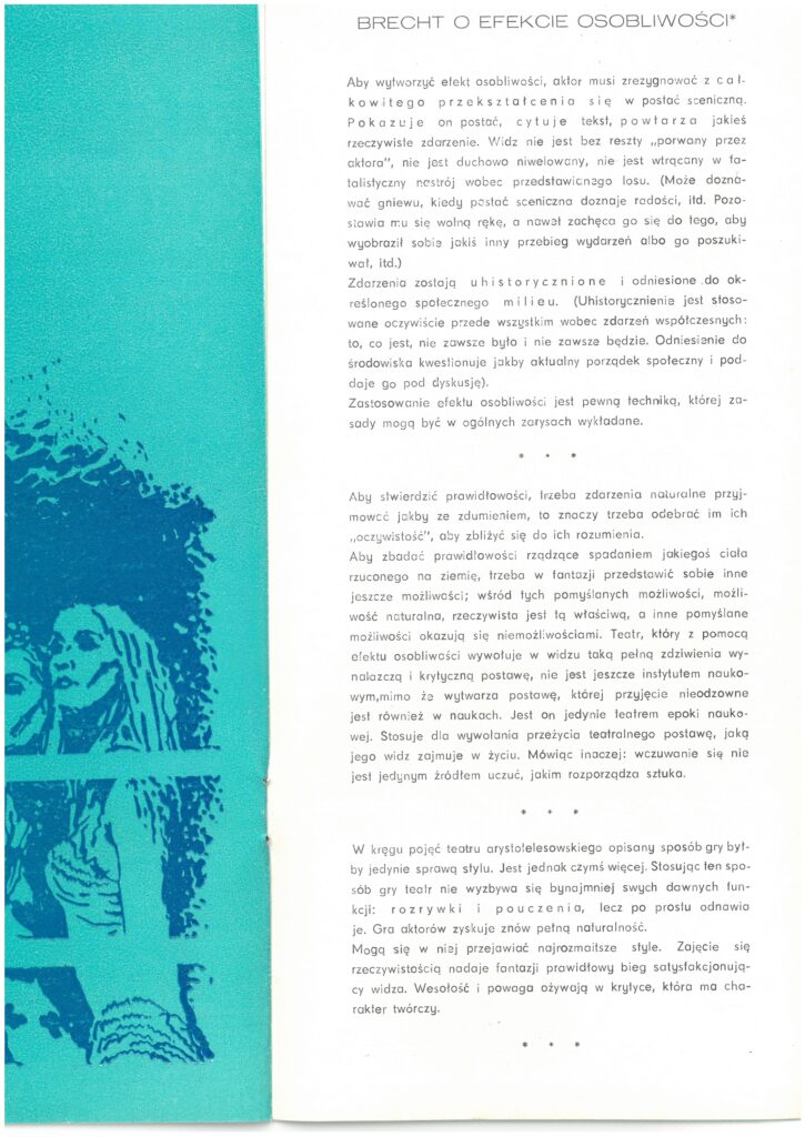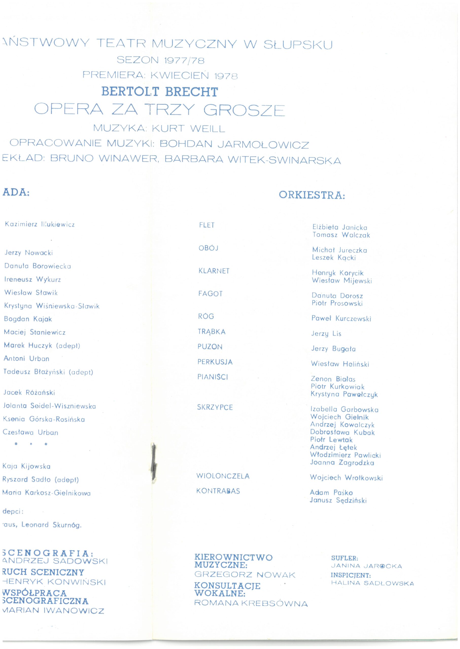 Narrator, Żebrak Jimmy – Kazimierz Illukiewicz, Pan Peachum – szef przedsiębiorstwa żebraków – Jerzy Nowacki, Pani Peachum – Danuta Borowiecka, Filch – Ireneusz Wykurz, Mackie Majcher – szef bandy – Wiesław Sławik, Polly – Krystyna Wiśniewska-Sławik, Matyjas – Bogdan Kajak, Kuba – Maciej Staniewicz, Robert – Piła, Żebrak – Marek Huczyk, Walter – Karawaniarz, Żebrak – Antoni Urban, Edek – Tadeusz Błażyński, Tygrys Brown – szef policji, Goniec królewski – Jacek Różański, Jenny – Jolanta Seidel-Wiszniewska, Wixen – Ksenia Górska-Rosińska Ksenia, Dolly – Czesława Urban, Honorata Smith – szefowa burdelu – Kaja Kijowska, Smith – Ryszrd Sadło, Lucy – Maria Karkosz-Gielnikowa, oraz adepci: Dorota Kardaś, Piotr Kraus, Leonard Skurnóg,