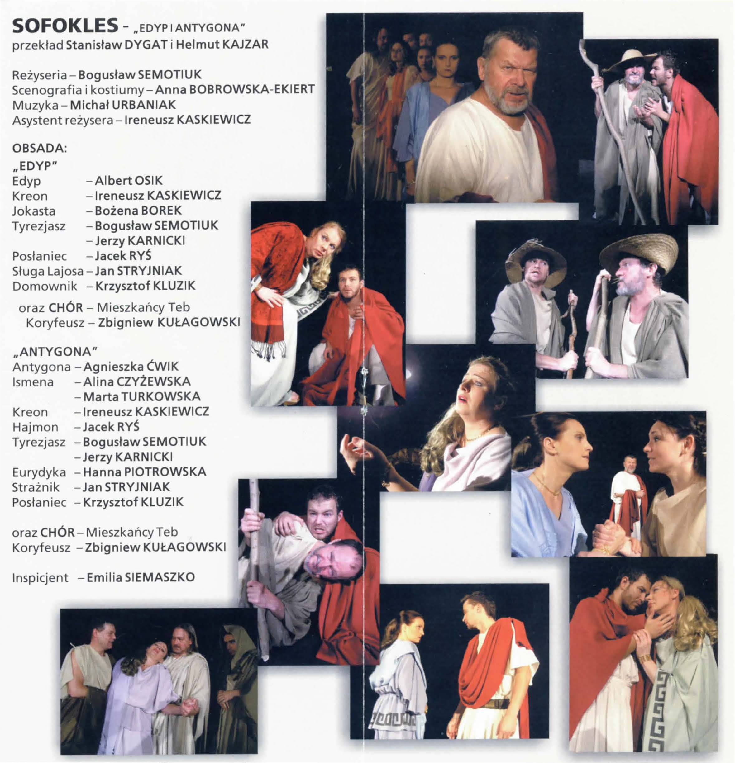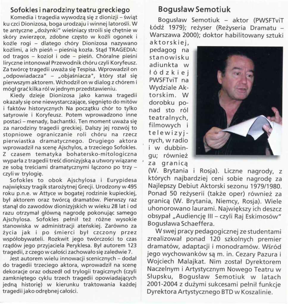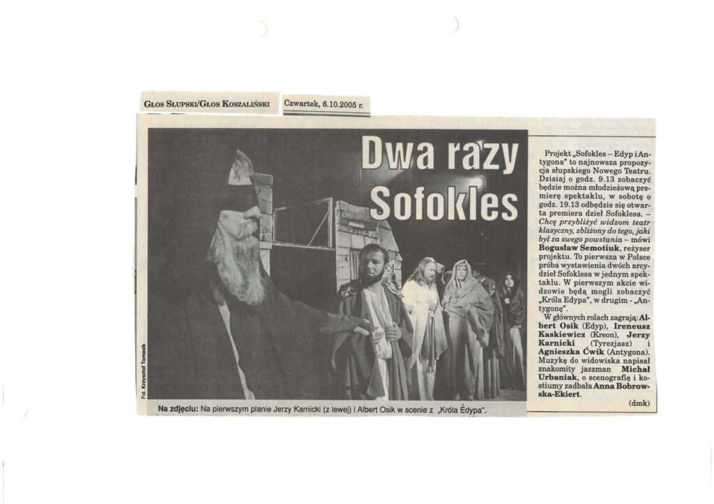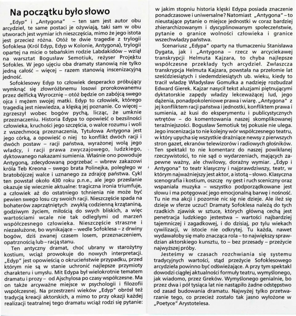 Scenariusz „Edypa” oparty na tłumaczeniu Stanisława Dygata, jak i „Antygona” – rzecz w arcyciekawej transkrypcji Helmuta Kajzara, to chyba najlepsze współczesne przekłady tych arcydzieł. Zwłaszcza transkrypcja Helmuta Kajzara, powstała na przełomie lat sześćdziesiątych i siedemdziesiątych ub. wieku, kiedy to tracił władzę Władysław Gomułka a nadzieję rozbudzał Edward Gierek. Kajzar nasycił tekst aluzjami piętnującymi dyktatorskie zapędy władzy lekceważącej lud, jego dążenia, ponadpokoleniowe prawa i wiarę. ,,Antygona” z jej konfliktem racji państwa i jednostki, konfliktem prawa i sumienia, aż kusi do eksperymentu i publicystycznych wtrętów – do komentowania naszej skomplikowanej teraźniejszości. Bogusław Semotiuk tej pokusie nie ulega. Jego inscenizacja to nie kolejny wór współczesnego teatru, w który upycha się wszystkie drażniące newsy z pierwszych stron gazet, ekranów telewizorów i radiowych głośników. Ten spektakl to nie komentarz do naszej powikłanej rzeczywistości, to nie sąd o wydarzeniach, mających zapewne ważny, ale chwilowy, doraźny wymiar. ,,Edyp i Antygona” to teatr klasyczny i najprawdziwszy, teatr, w którym najważniejszy jest aktor, a istotą-słowo. Klasyczna scenografia i kostium, oszczędny gest i ruch sceniczny oraz wspaniała muzyka – wszystko podporządkowane jest słowu i ma potęgować jego emocjonalną barwę i nośność . Tu nie ma akcji i pozornie nic się nie dzieje. Ale ileż się dzieje w sferze uczuć! Dramaty Sofoklesa należą do tych rzadkich zjawisk w sztuce, których główną cechą jest penetracja ludzkiego jestestwa – wartości najbardziej tajemniczej i zagadkowej, i do dzisiaj, po tylu wiekach cywilizacji, w istocie nie odkrytej. Tu każda, nawet wydawałoby się mało znacząca rola -to największy sprawdzian aktorskiego kunsztu, to – bez przesady – przeżycie najwyższej próby.
