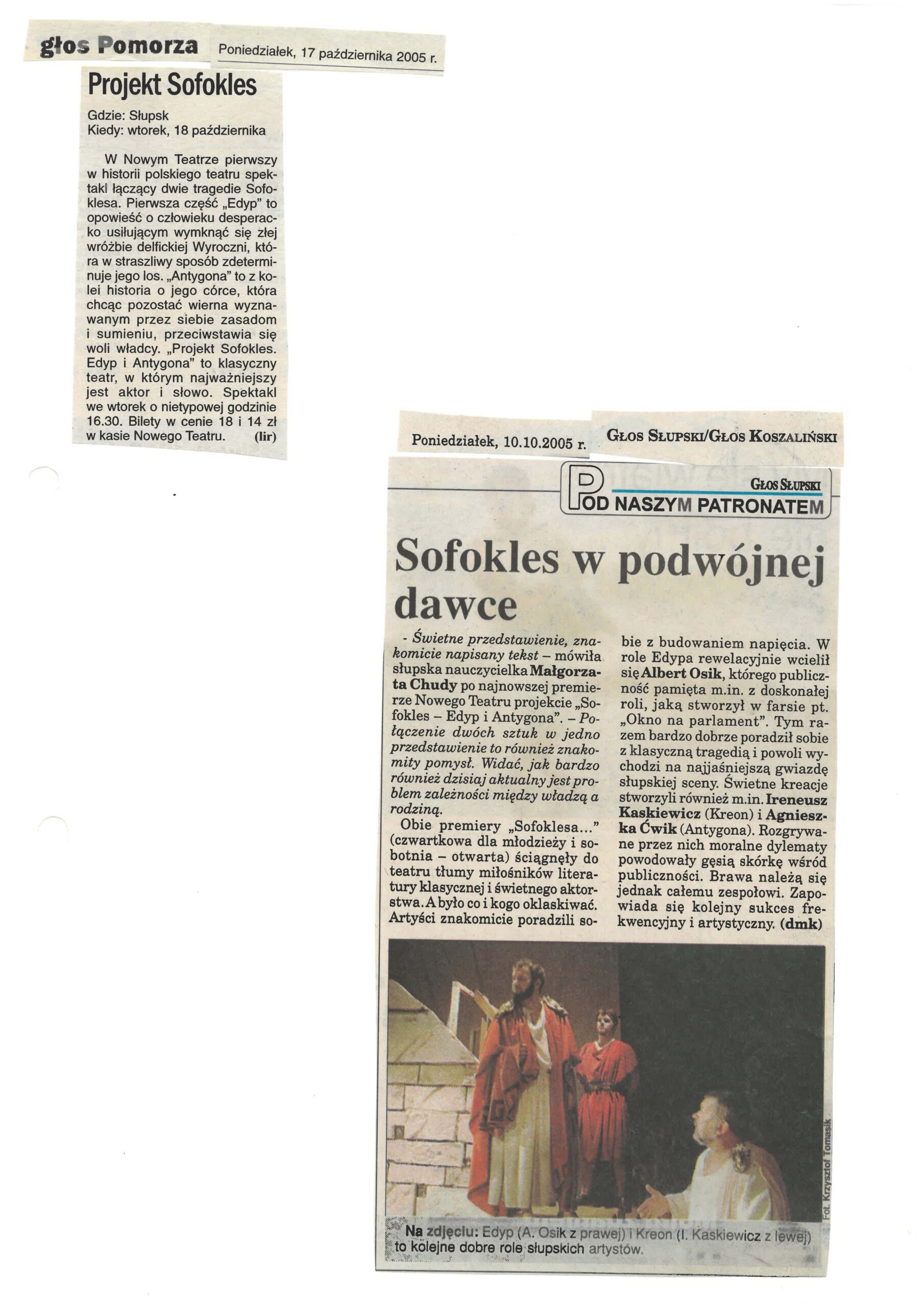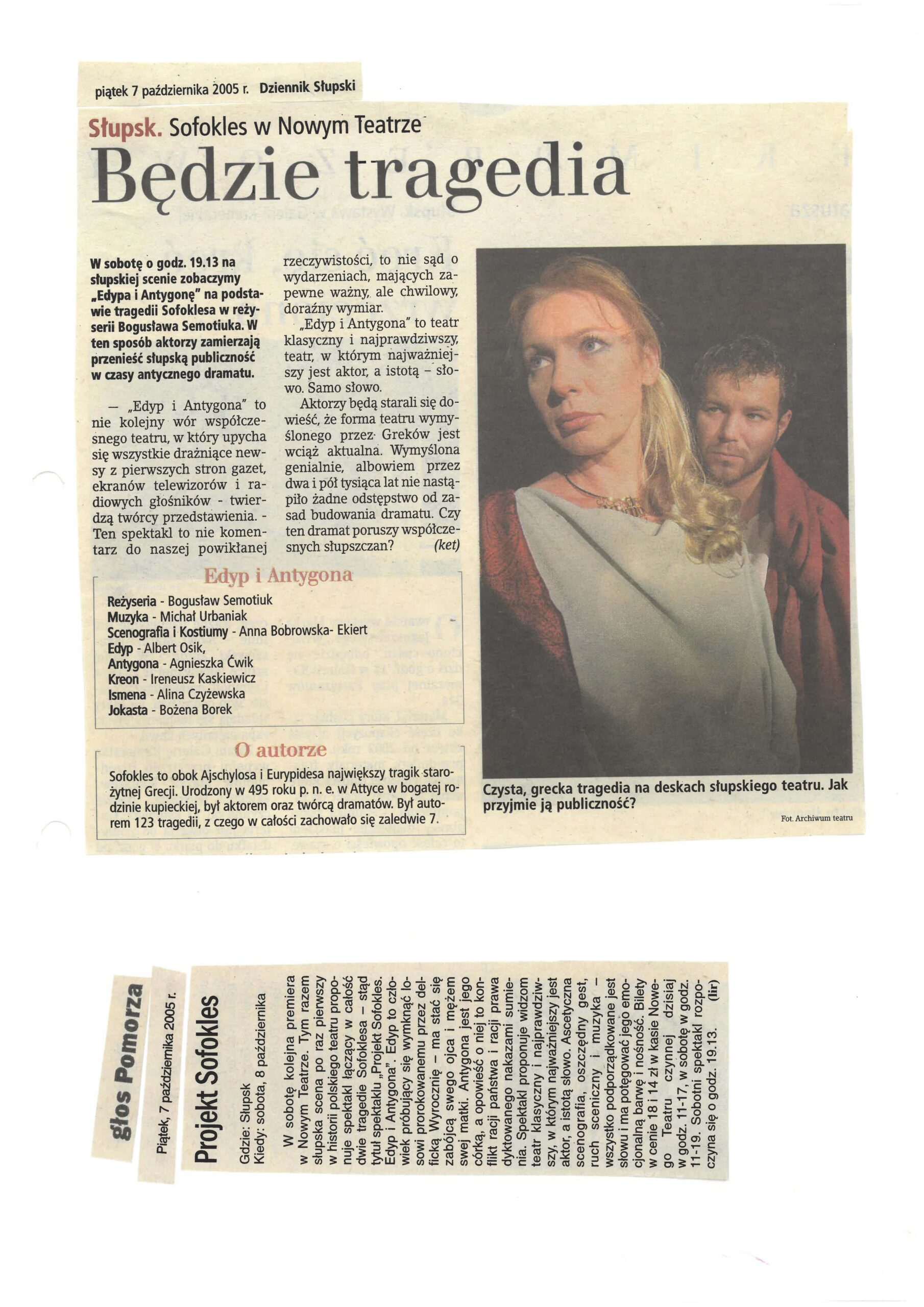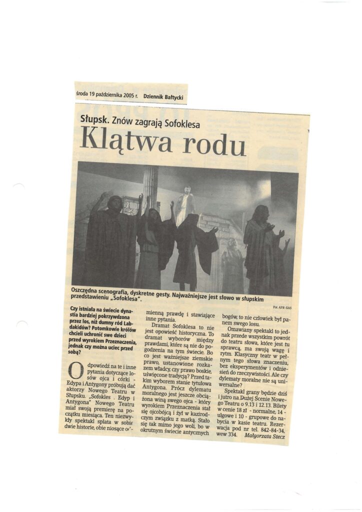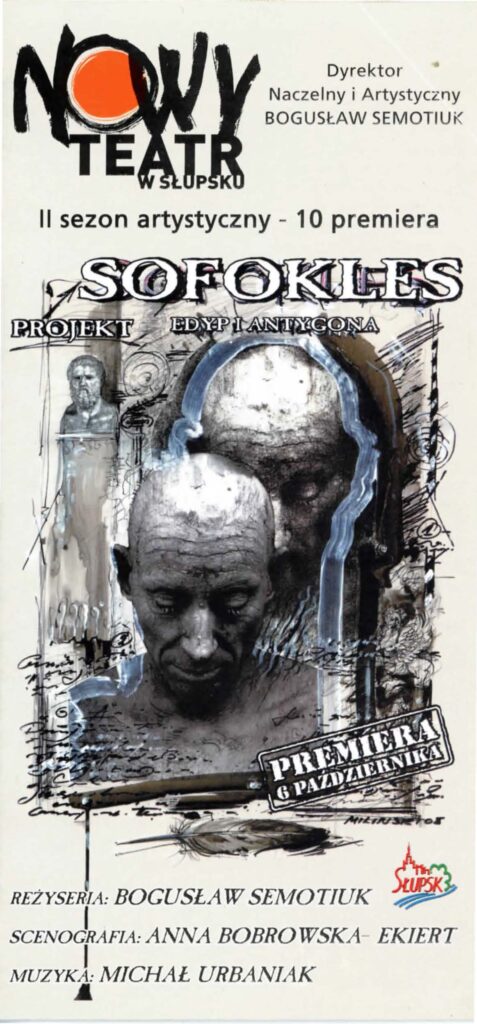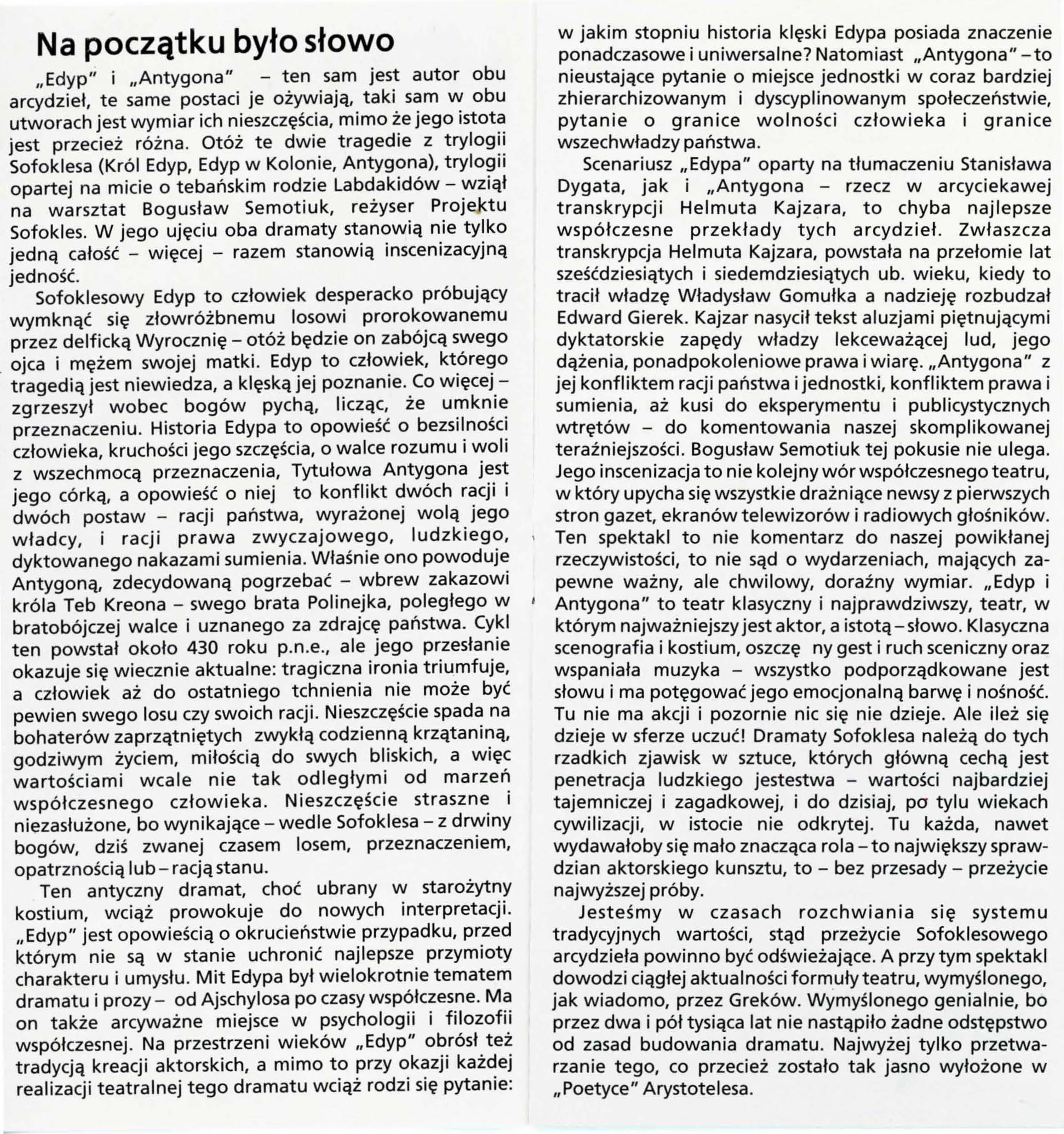 Scenariusz „Edypa” oparty na tłumaczeniu Stanisława Dygata, jak i „Antygona” – rzecz w arcyciekawej transkrypcji Helmuta Kajzara, to chyba najlepsze współczesne przekłady tych arcydzieł. Zwłaszcza transkrypcja Helmuta Kajzara, powstała na przełomie lat sześćdziesiątych i siedemdziesiątych ub. wieku, kiedy to tracił władzę Władysław Gomułka a nadzieję rozbudzał Edward Gierek. Kajzar nasycił tekst aluzjami piętnującymi dyktatorskie zapędy władzy lekceważącej lud, jego dążenia, ponadpokoleniowe prawa i wiarę. ,,Antygona” z jej konfliktem racji państwa i jednostki, konfliktem prawa i sumienia, aż kusi do eksperymentu i publicystycznych wtrętów – do komentowania naszej skomplikowanej teraźniejszości. Bogusław Semotiuk tej pokusie nie ulega. Jego inscenizacja to nie kolejny wór współczesnego teatru, w który upycha się wszystkie drażniące newsy z pierwszych stron gazet, ekranów telewizorów i radiowych głośników. Ten spektakl to nie komentarz do naszej powikłanej rzeczywistości, to nie sąd o wydarzeniach, mających zapewne ważny, ale chwilowy, doraźny wymiar. ,,Edyp i Antygona” to teatr klasyczny i najprawdziwszy, teatr, w którym najważniejszy jest aktor, a istotą-słowo. Klasyczna scenografia i kostium, oszczędny gest i ruch sceniczny oraz wspaniała muzyka – wszystko podporządkowane jest słowu i ma potęgować jego emocjonalną barwę i nośność . Tu nie ma akcji i pozornie nic się nie dzieje. Ale ileż się dzieje w sferze uczuć! Dramaty Sofoklesa należą do tych rzadkich zjawisk w sztuce, których główną cechą jest penetracja ludzkiego jestestwa – wartości najbardziej tajemniczej i zagadkowej, i do dzisiaj, po tylu wiekach cywilizacji, w istocie nie odkrytej. Tu każda, nawet wydawałoby się mało znacząca rola -to największy sprawdzian aktorskiego kunsztu, to – bez przesady – przeżycie najwyższej próby.