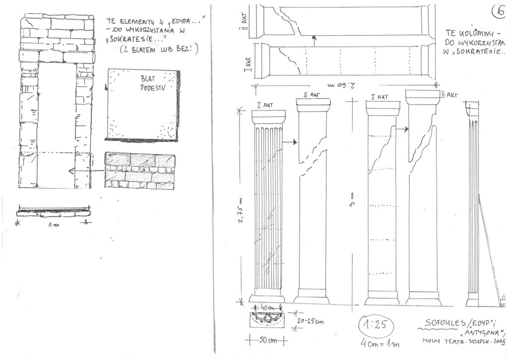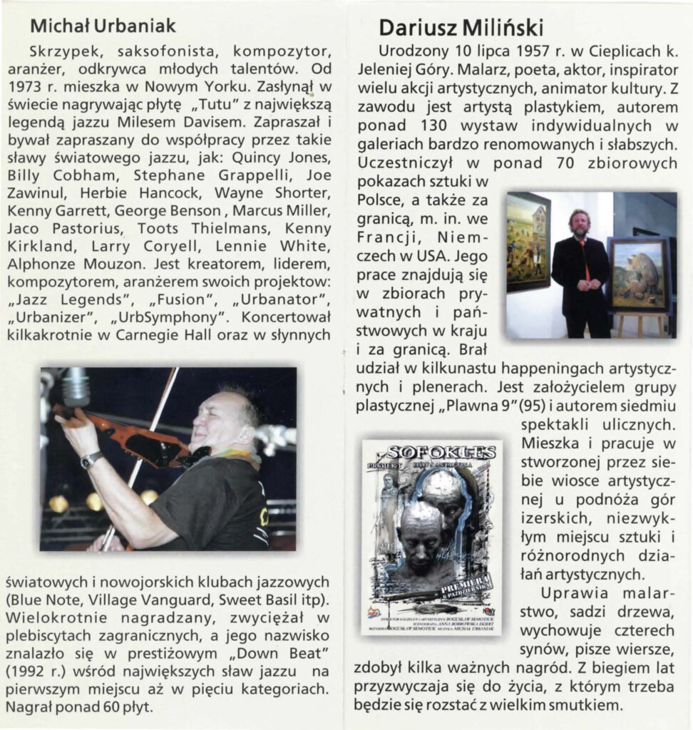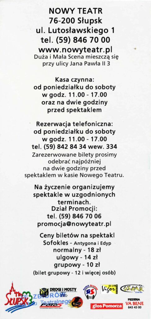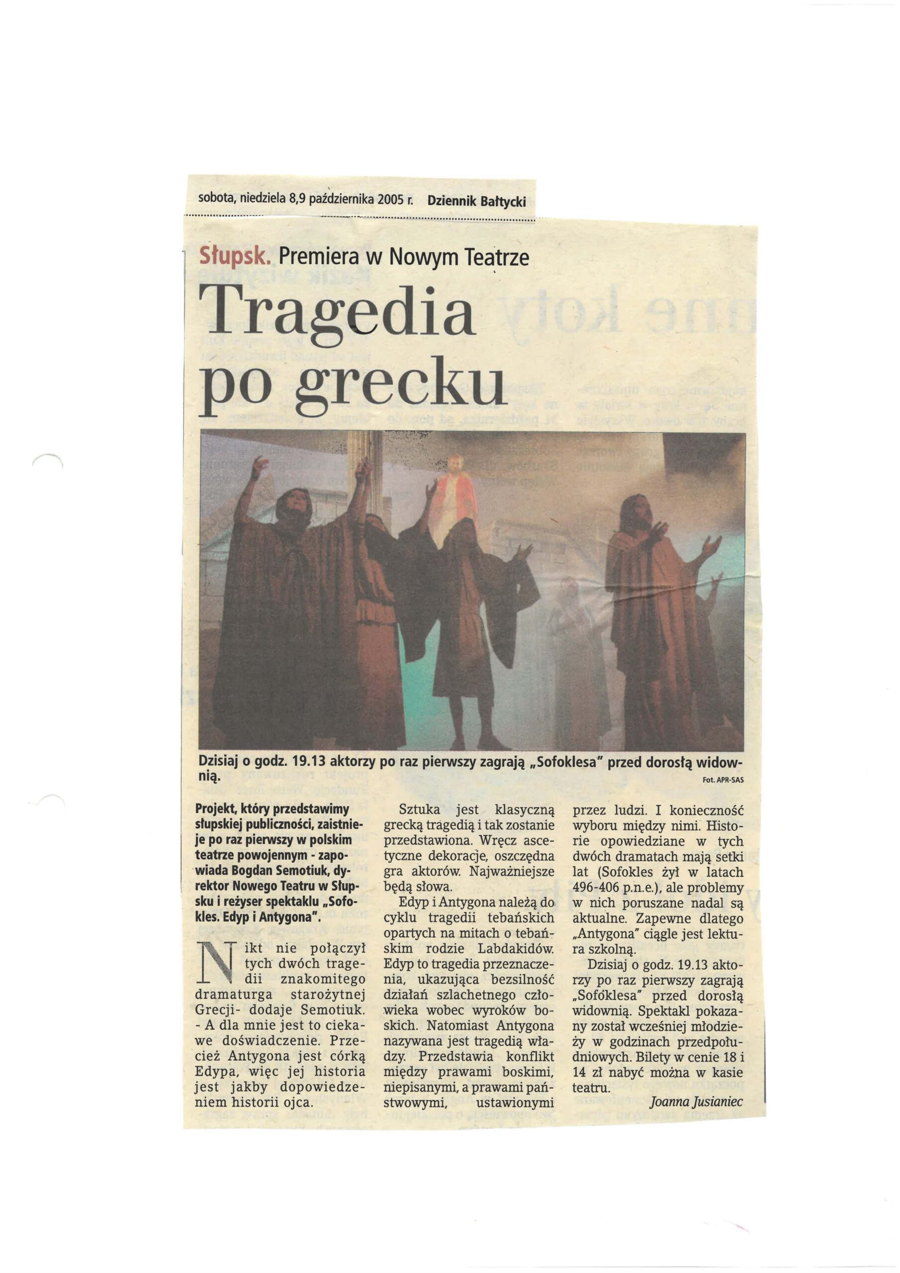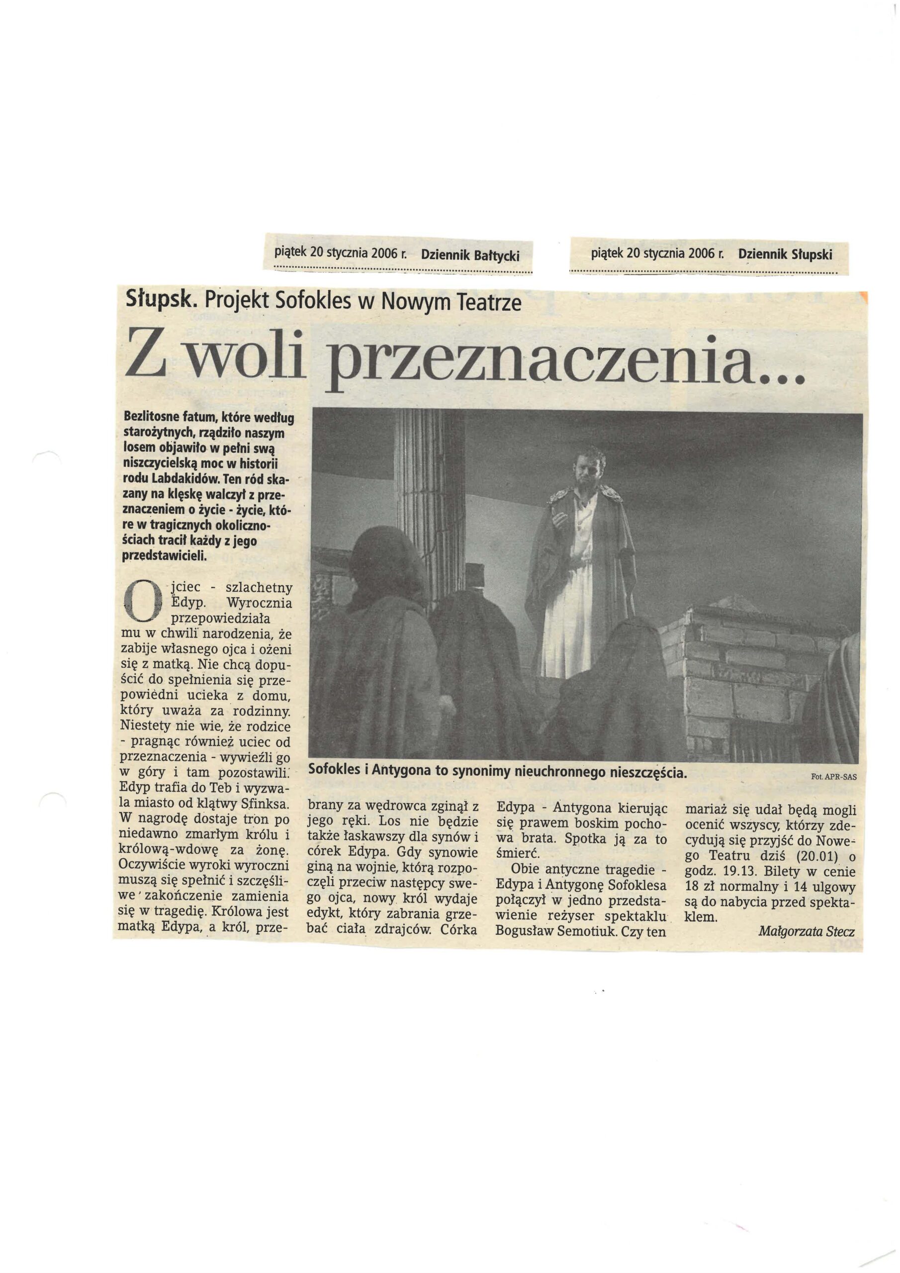 Scenariusz „Edypa” oparty na tłumaczeniu Stanisława Dygata, jak i „Antygona” – rzecz w arcyciekawej transkrypcji Helmuta Kajzara, to chyba najlepsze współczesne przekłady tych arcydzieł. Zwłaszcza transkrypcja Helmuta Kajzara, powstała na przełomie lat sześćdziesiątych i siedemdziesiątych ub. wieku, kiedy to tracił władzę Władysław Gomułka a nadzieję rozbudzał Edward Gierek. Kajzar nasycił tekst aluzjami piętnującymi dyktatorskie zapędy władzy lekceważącej lud, jego dążenia, ponadpokoleniowe prawa i wiarę. ,,Antygona” z jej konfliktem racji państwa i jednostki, konfliktem prawa i sumienia, aż kusi do eksperymentu i publicystycznych wtrętów – do komentowania naszej skomplikowanej teraźniejszości. Bogusław Semotiuk tej pokusie nie ulega. Jego inscenizacja to nie kolejny wór współczesnego teatru, w który upycha się wszystkie drażniące newsy z pierwszych stron gazet, ekranów telewizorów i radiowych głośników. Ten spektakl to nie komentarz do naszej powikłanej rzeczywistości, to nie sąd o wydarzeniach, mających zapewne ważny, ale chwilowy, doraźny wymiar. ,,Edyp i Antygona” to teatr klasyczny i najprawdziwszy, teatr, w którym najważniejszy jest aktor, a istotą-słowo. Klasyczna scenografia i kostium, oszczędny gest i ruch sceniczny oraz wspaniała muzyka – wszystko podporządkowane jest słowu i ma potęgować jego emocjonalną barwę i nośność . Tu nie ma akcji i pozornie nic się nie dzieje. Ale ileż się dzieje w sferze uczuć! Dramaty Sofoklesa należą do tych rzadkich zjawisk w sztuce, których główną cechą jest penetracja ludzkiego jestestwa – wartości najbardziej tajemniczej i zagadkowej, i do dzisiaj, po tylu wiekach cywilizacji, w istocie nie odkrytej. Tu każda, nawet wydawałoby się mało znacząca rola -to największy sprawdzian aktorskiego kunsztu, to – bez przesady – przeżycie najwyższej próby.