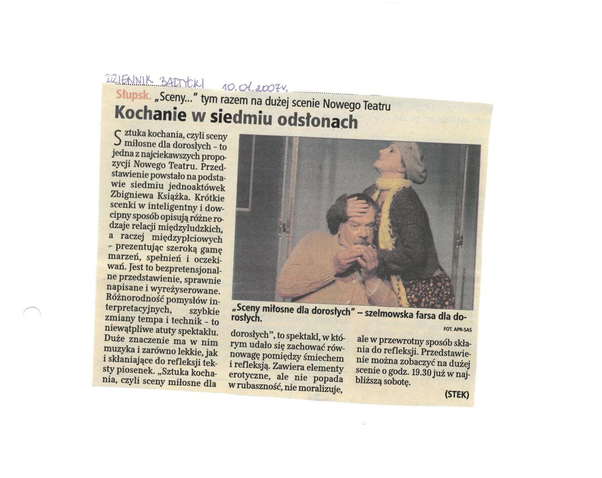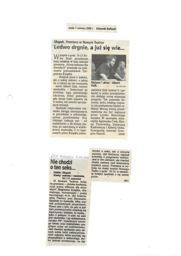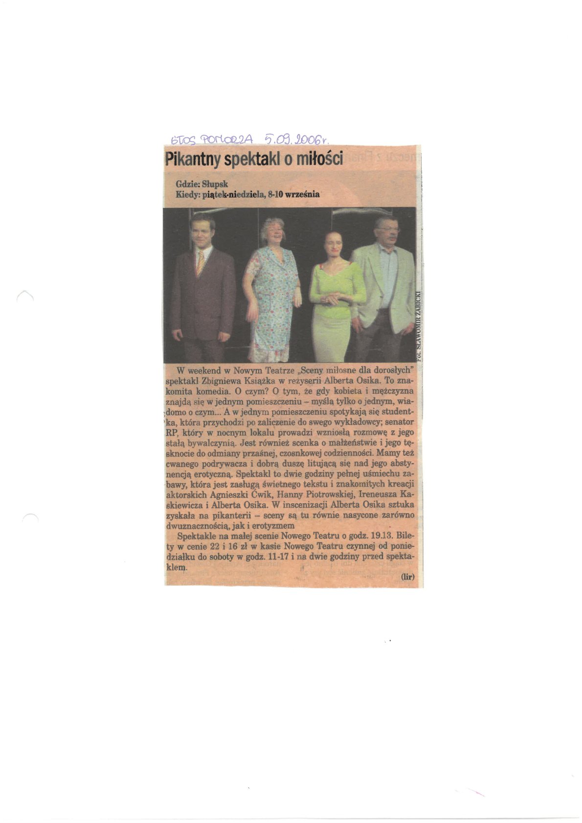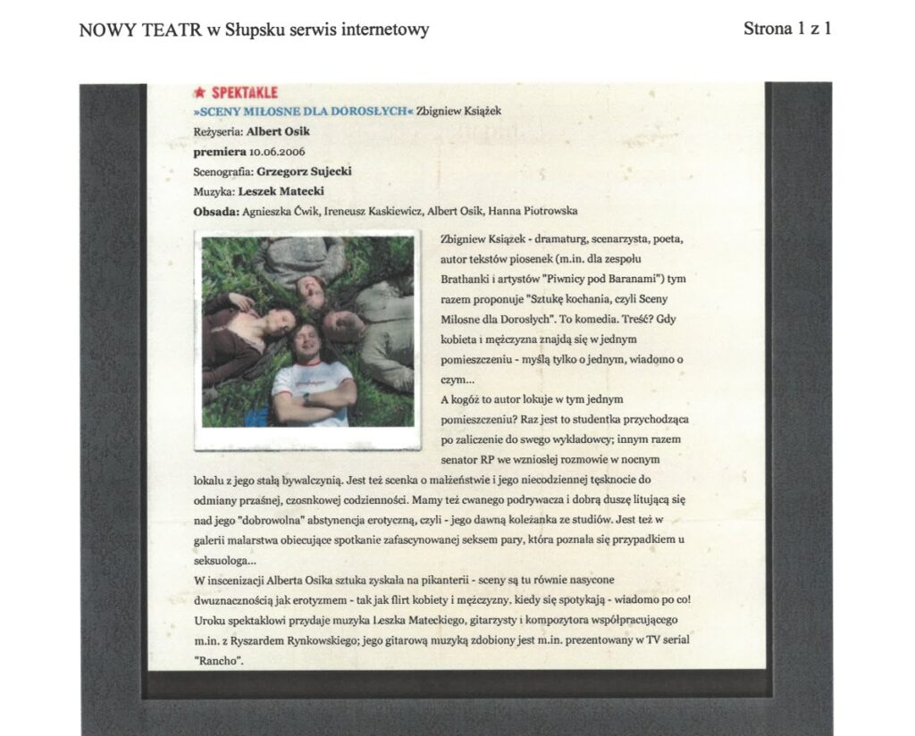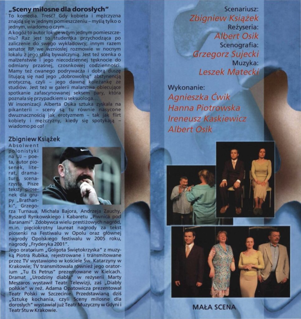 Na podstawie utworu Sceny miłosne dla dorosłych Zbigniewa Książka. Premiera: 10.06.2006 r.