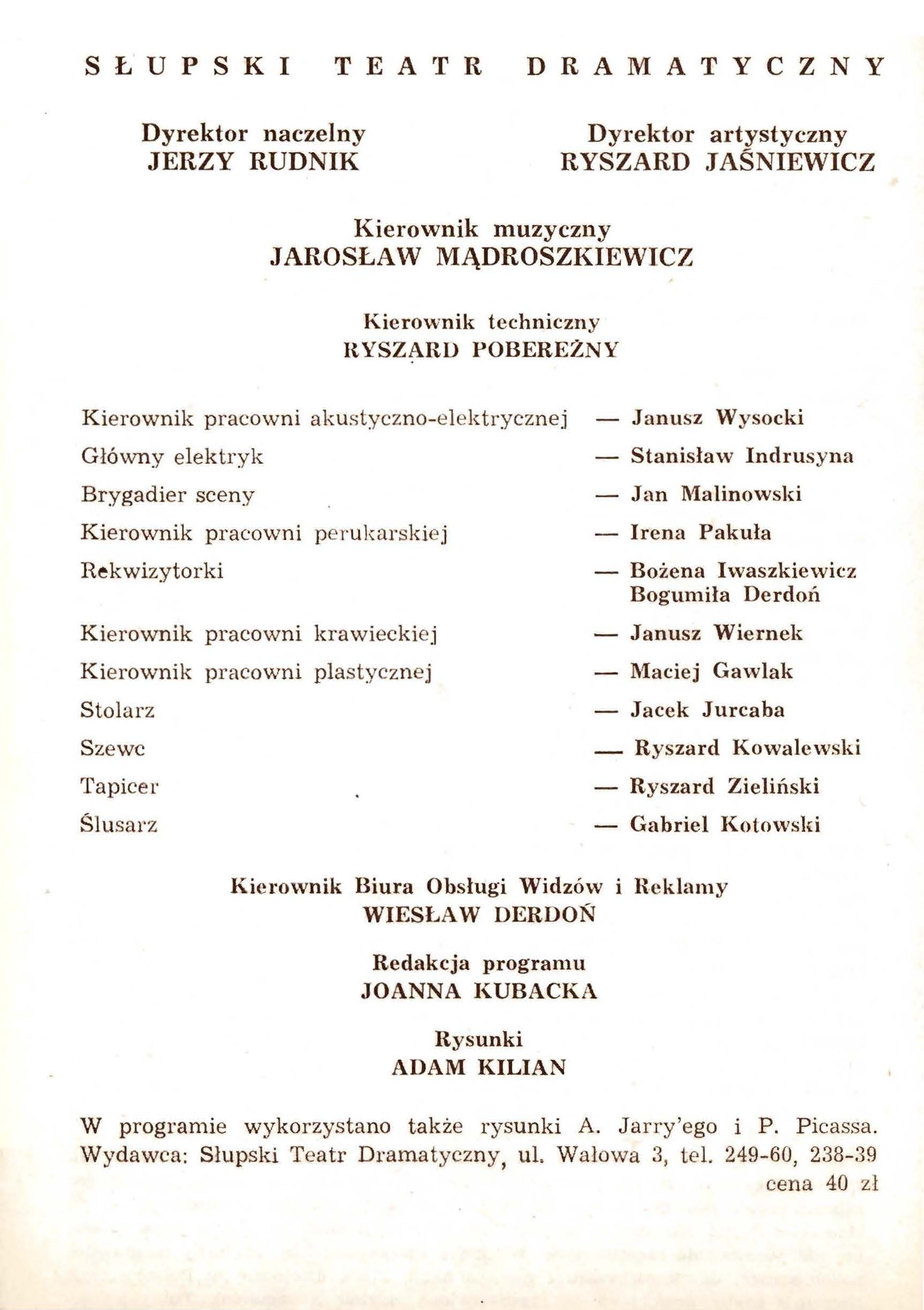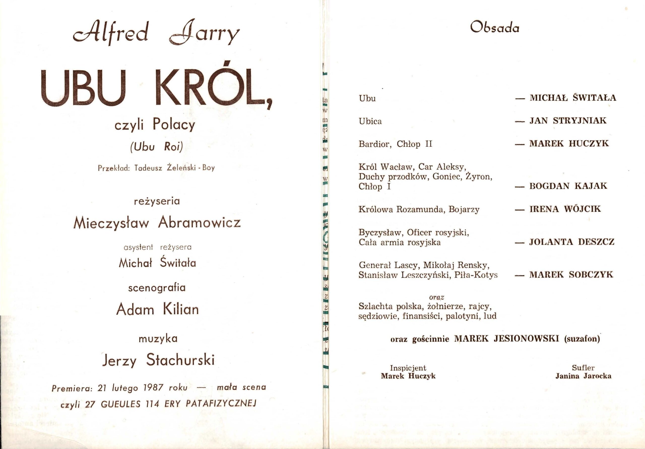 Ubu – Michał Świtała, Ubica – Jan Stryjniak, Bardior, Chłop II – Marek Huczyk, Król Wacław, Car Aleksy, Duchy przodków, Goniec, Żyron, Chłop I – Bogdan Kajak, Królowa Rozamunda, Bojarzy – Irena Wójcik, Byczysław, Oficer rosyjski, Cała armia rosyjska – Jolanta Deszcz, Generał Lascy, Mikołaj Rensky, Stanisław Leszczyński, Piła-Kotys – Marek Sobczyk oraz Marek Jesionowski na suzafonie