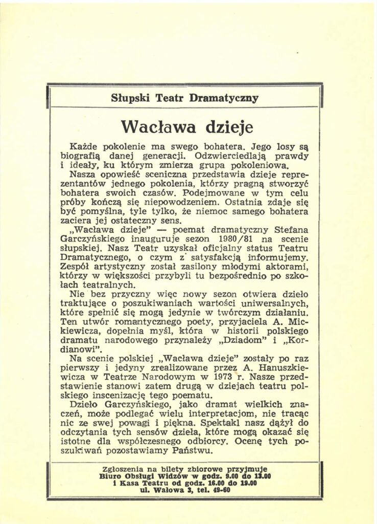 Poemat Stefana Gałczyńskiego, który nasz zespół postanowił zaprezentować publiczności jest w polskiej literaturze jednym z najjaskrawszych przejawów romantycznego indywidualizmu, a przecież jednocześnie jest próbą pogodzenia tego indywidualizmu z poczuciem tożsamości narodowej i głębokiej więzi społecznej, łączącej bohatera z otaczającym go światem. „Wacława dzieje” traktujemy jak tekst współczesnego nam rówieśnika, a biografię wymyślonej przez niego postaci jak biografię bohatera z naszego pokolenia. Grupa ludzi, którą widzimy na scenie, próbuje opowiedzieć taką biografię językiem teatralnym. Próbuje ją wykreować tu i teraz, posługując się słowami, które należą już do historiii literatury, a przecież są dla nas żywe i przejmujące. Próba opowiedzenia losów Wacława, tak jak w poemacie, podlega wciąż odradzającym się komplikacjom i przeszkodom. Te siły przeciwdziałające nie pochodzą z zewnątrz. Tkwią w łonie tego samego pokolenia, z jakiego wyszedł Wacław.